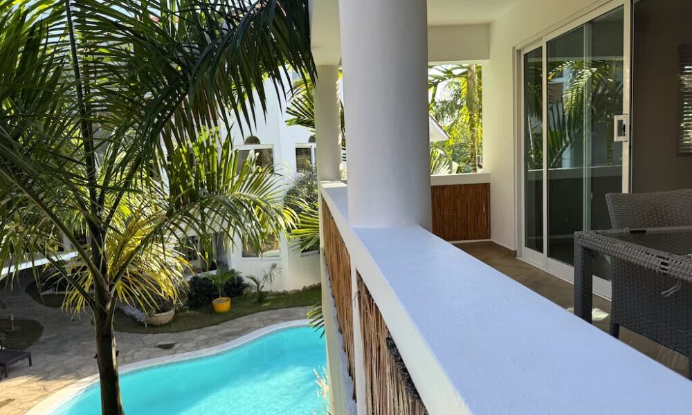 Para dos parejas o una familia de máximo cuatro personas que busquen amplitud, este cómodo apartamento vacacional de 120 metros cuadrados (1300 pies cuadrados) con dos dormitorios en Cabarete ha sido recientemente reformado. Ubicado en la primera planta, al que se accede por una escalera de caracol, cuenta con una espaciosa terraza privada con vistas a un jardín tropical.